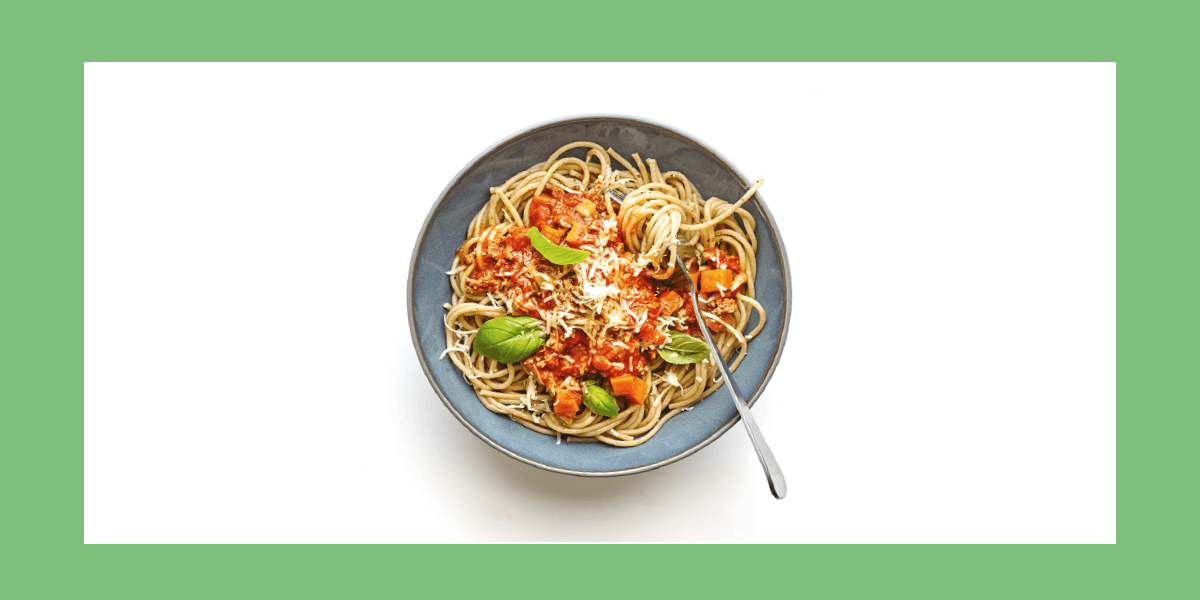 Eksempel på en klimavenlig udgave af spaghetti med kødsovs - spaghetti med linsesovs