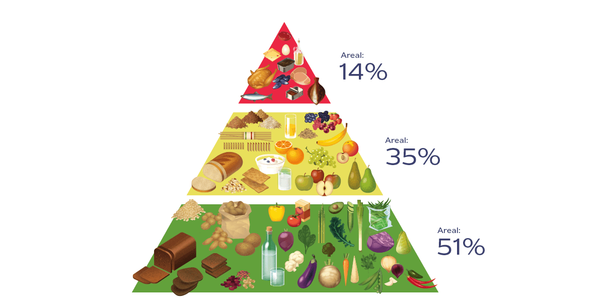 Arealet af top, midte og bund illustrerer, hvor meget du bør spise. Arealet af toppen af Madpyramiden udgør kun ca. 14 %, så derfor bør kød og ost indgå i små mængder. Bunden udgør til gengæld hele 51 %. Godt halvdelen af din kost skal altså komme fra bunden. Inden for hvert niveau ligger de mest klimabelastende fødevarer i toppen. Derfor er det røde kød i toppen af det øverste lag og ris i toppen af det midterste lag.